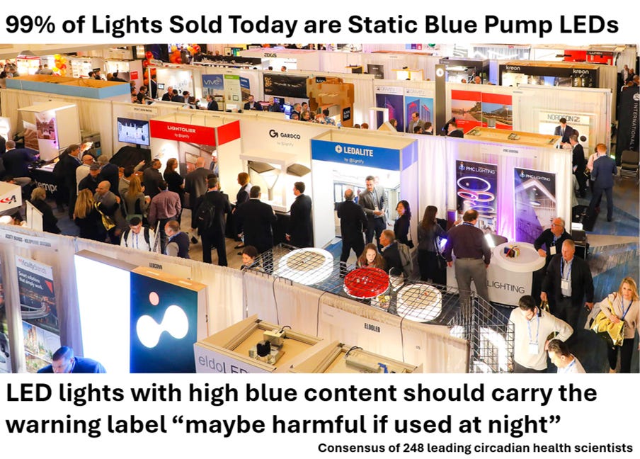 Lighting is not just for vision and aesthetics. As the readers of THE LIGHT DOCTOR newsletter know, there is considerable scientific evidence that the spectral composition, intensity and timing of visible and invisible light wavelengths have profound effects on human health. The evidence is so strong that 248 leading circadian health scientists reached consensus that “LED lights with high blue content should carry the warning label “maybe harmful if used at night”.