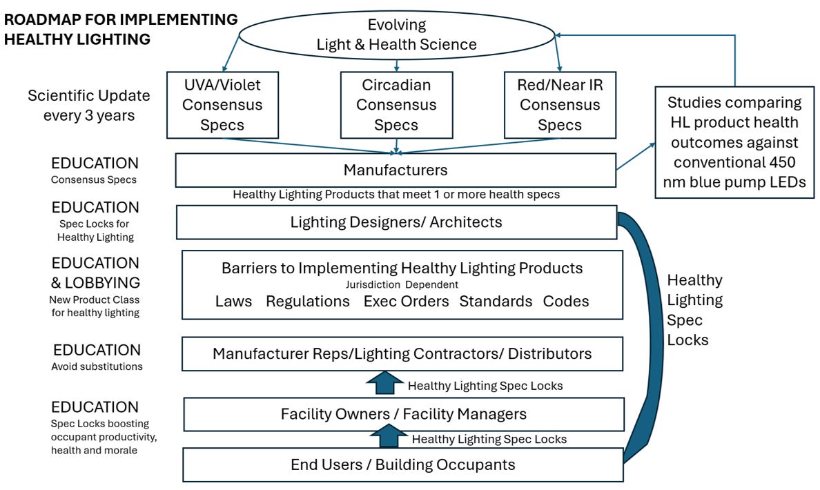A better approach may be to define and seek approval of healthy lighting as a new product class not subject to vision-only lighting rules. The requirements to meet this new product class would be defined by the consensus healthy lighting specifications.